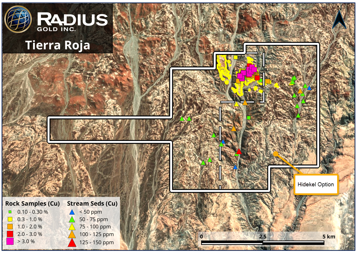 Vancouver, Canada – Radius Gold Inc. (TSXV: RDU) ("Radius" or the "Company") is pleased to announce that it has signed a Mining Assignment and Option Agreement to acquire the 1,800-hectare Hidekel concessions directly adjoining its 100%-owned Tierra Roja copper project in southern Peru (see press release Feb 28, 2025). The remaining concessions under review have been released. The signing of this Mining Assignment and Option Agreement consolidates Radius’s land position at Tierra Roja and strengthens the Company’s control over one of the most compelling copper exploration targets in the district.