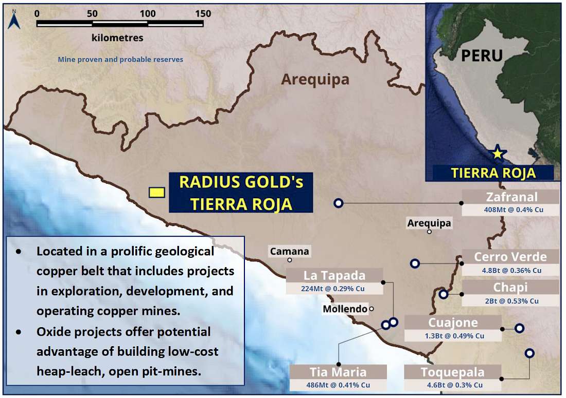 Bruce Smith, Radius Gold President and CEO, commented: “Having recently completed a due diligence site visit in Peru, I am very impressed by the Tierra Roja project. It has all the right indicators to make a significant copper discovery. It has scale, the right alteration features and abundant copper oxides in outcrop. There are no people or communities living on or near the site, and is an easy access, low-cost exploration target, in one of the world’s most prolific copper producing districts. We look forward to completing an option agreement and commencing exploration.”
