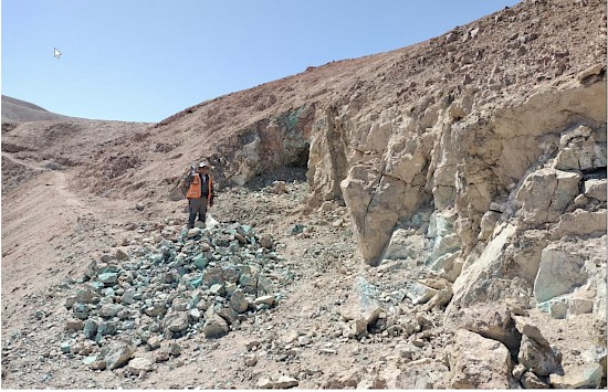 Figure 2. High grade copper oxide mineralization hosted in intensely altered intrusive exposed in bulldozer cut: