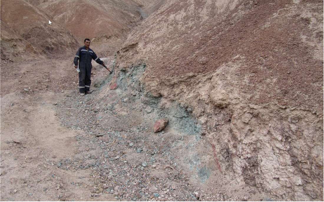 Figure 3. Copper oxides exposed beneath ferruginous (iron rich) soil crust in small creek bed. Note above the exposed mineralization the copper is not visible in the desert soil crust: