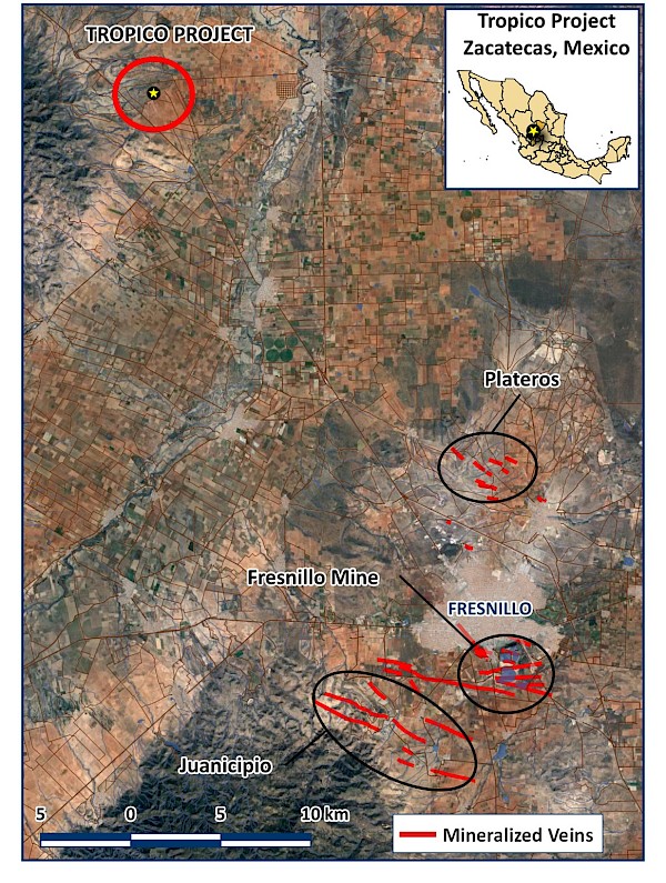 The Tropico target is located 30 km northwest of Fresnillo city, Zacatecas, Mexico. The Fresnillo mining district is one of the world’s greatest epithermal systems and hosts the world’s oldest continuously operating mines producing silver, gold, copper, lead, and zinc for approximately five centuries, since 1554. The district has over 150 veins, mantos and chimney deposits including +30 large scale ore producers and it continues to deliver new discoveries. In 2005, the Juanicipio project was discovered by MAG Silver Corp and Fresnillo Plc, located 8 km from Fresnillo city. This recent discovery is one of the world’s highest grade and largest primary silver (plus gold) development projects [MAG Silver PEA November 7, 2017].