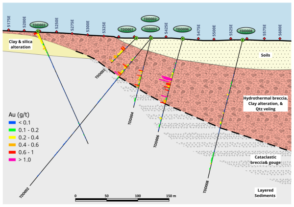 Drilling defined a large gold mineralized breccia body that starts at surface and to date defined 250m down dip. Gold grades were starting to increase with depth from holes 1, 2, 3, 4, & 6, (see press release Nov. 7, 2023) but unfortunately the latest gold assay results from the deepest hole 8 are weak. (See Figure 1 and corresponding Table 1 below.) The drilling encountered wide zones of classic low sulphidation epithermal alteration, high level chalcedonic silica, banded stockwork and massive quartz veining, and breccias with gold mineralization, but not significant high grade mineralization.