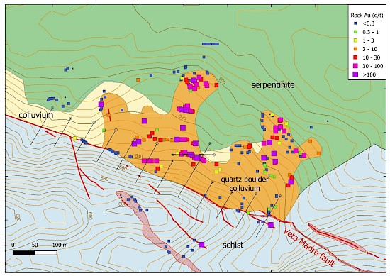 Drilling to date has confirmed that the broad area of boulder float with abundant visible gold and bonanza grade assay results discovered by Volcanic geologists is underlain by a serpentinite package, and that all of the colluvial boulders of quartz and schists bearing the high-grade gold values have likely moved downslope from a major structural corridor that the JV has named the Veta Madre Fault Zone.